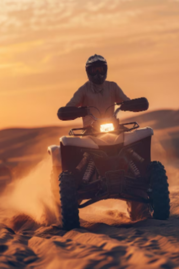 Enjoy a premium Evening Desert Safari with Quad Bike in Dubai, featuring 25–30 minutes of quad biking, luxury 4×4 pick-up, thrilling dune bashing, sunset views, live entertainment, and a VIP BBQ buffet dinner